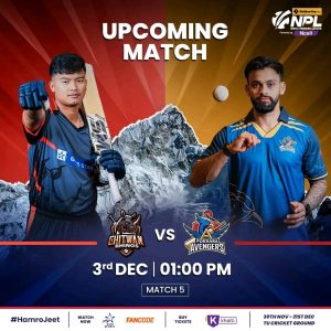 यस्तै, आजको दोस्रो खेलमा चितवन राइनोज र पोखरा एभेन्जर्सबिच प्रतिस्पर्धा हुनेछ । प्रतियोगितामा चितवनको यो दोस्रो खेल हो । चितवनले यसअघि आफ्नो पहिलो खेलमा हिजो