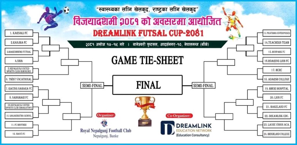 नेपालगञ्ज – १७ , रोयल नेपालगन्ज फुटबल क्लब र ड्रिमलिंक एजुकेशन नेटवर्कको आयोजनामा नेपालगन्ज १०, आदर्शनगरस्थित बागेश्वरी फुटसलमा असोज १७ देखि १९ गतेसम्म ड्रिमलिंक फुटसल कप २०८१ आयोजना हुँदैछ। “राष्ट्रका लागि खेलकुद, स्वास्थ्यका लागि खेलकुद, युवाका लागि खेलकुद” भन्ने नारासहित यो प्रतियोगिता विजयादशमीको सु–अवसरमा आयोजना गर्न लागिएको हो।
