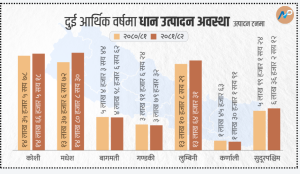 गत आर्थिक वर्ष वर्षे धान ५२ लाख ३ हजार ४ सय २६ टन उत्पादन भएकोमा यो वर्ष ५४ लाख ११ हजार ८३ टन पुगेको छ । यस्तै चैते धान ५ लाख २० हजार ८ सय ८ टन उत्पादन भएको थियो भने यो आवमा ५ लाख ४४ हजार ३ सय ९३ टन उत्पादन भएको हो ।