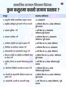 सरकारले प्रस्ताव गरेको विधेयक अनुसार अनुमति नलिई सामाजिक सञ्जाल सञ्चालन गरेमा २५ लाखसम्म जरिवाना, राष्ट्रहितविपरीत कार्य गरेमा ५ वर्षसम्म जेल वा ५ लाख जरिवाना, साइबर बुलिङ, गलत सूचना प्रवाह, डिपफेक भिडियो प्रसारण जस्ता कार्यहरूमा कडा कारबाहीको व्यवस्था गरिएको छ। साथै, साइबर स्टकिङ तथा कसैको आइडी ह्याक गरेमा ३ वर्षसम्म जेल वा १५ लाख रुपैयाँसम्म जरिवाना प्रस्ताव गरिएको छ।