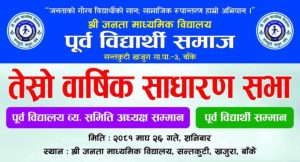 माघ २६, २०८१ बाँके : श्री जनता माध्यमिक विद्यालय, सन्तकुटी, खजुराको पूर्व विद्यार्थी समाजको तेस्रो साधारण सभा शनिबार एक कार्यक्रमका बीच सम्पन्न भएको छ।