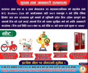 नेपालगन्ज, माघ २९ :नेपालगन्ज उपमहानगरपालिका वडा नं. ५ ले आयोजना गर्न लागेको वडा स्तरीय टेनिस क्रिकेट प्रतियोगिताको सम्पूर्ण तयारी पूरा भएको वडा अध्यक्ष सराफत हुसेन शेषले जानकारी दिएका छन्।
