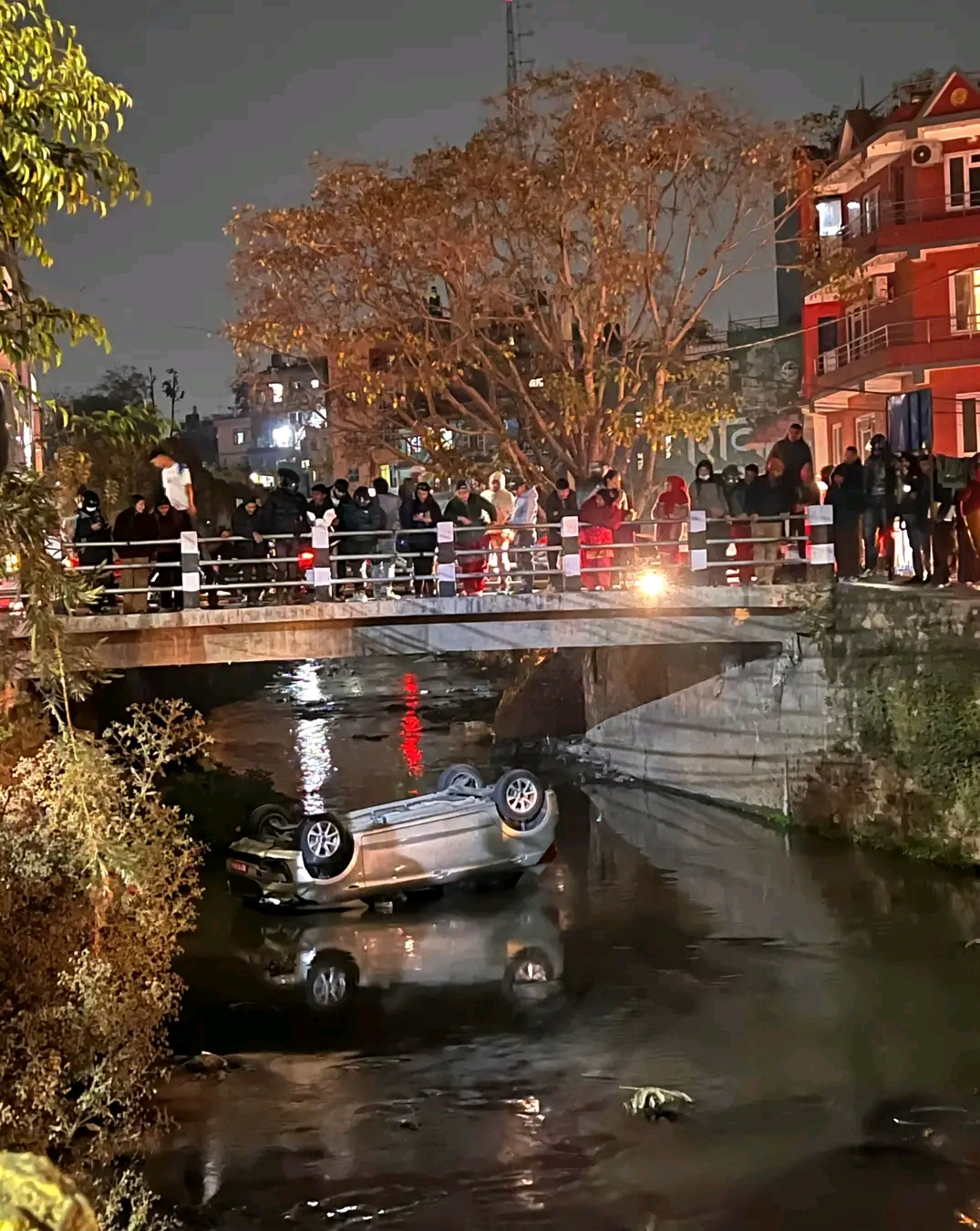 काठमाडौं : आइतबार साँझ काठमाडौंको धोबीखोलामा कार दुर्घटना भएको छ। जिल्ला प्रहरी परिसर, काठमाडौंका अनुसार बा २१ च ६६१४ नम्बरको कार अनियन्त्रित भई रुद्रमति पुलबाट खोलामा खसेको हो।