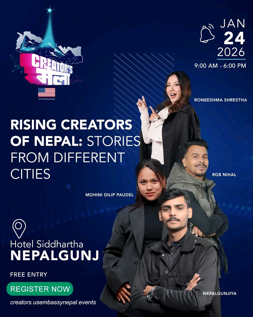 नेपालगन्ज पोष्ट : नेपालगन्जलाई सिर्जनशीलता, नवप्रवर्तन र डिजिटल संस्कृतिको राष्ट्रिय केन्द्रका रूपमा स्थापित गर्ने लक्ष्यसहित आगामी माघ ११ गते शनिबार (जनवरी २४, २०२६) ‘क्रिएटर्स मेला–२०२६’ आयोजना हुने भएको छ। अमेरिकी दूतावास, नेपालको आयोजनामा हुन लागेको यो मेला नेपालगन्जका लागि नयाँ सम्भावनाको ढोका खोल्ने कार्यक्रमका रूपमा हेरिएको छ।