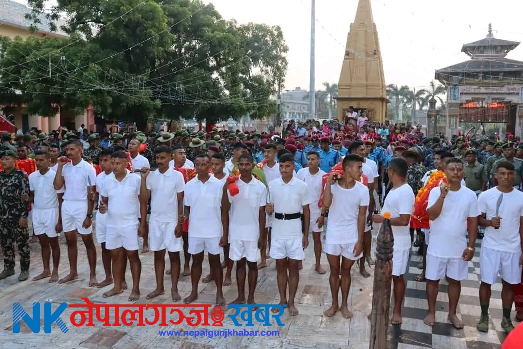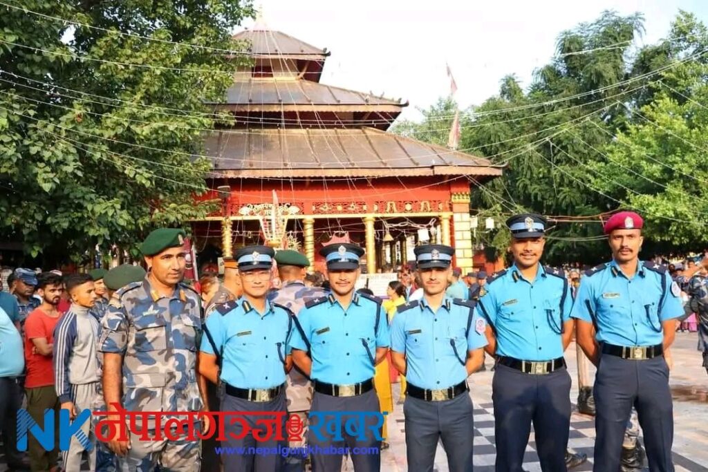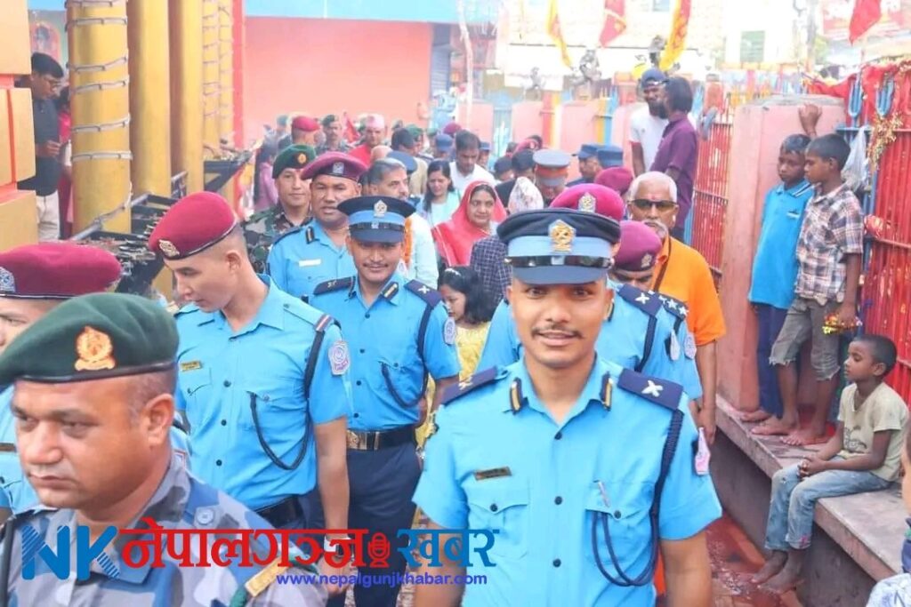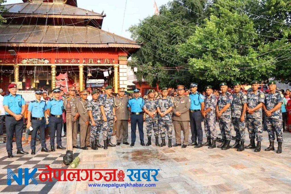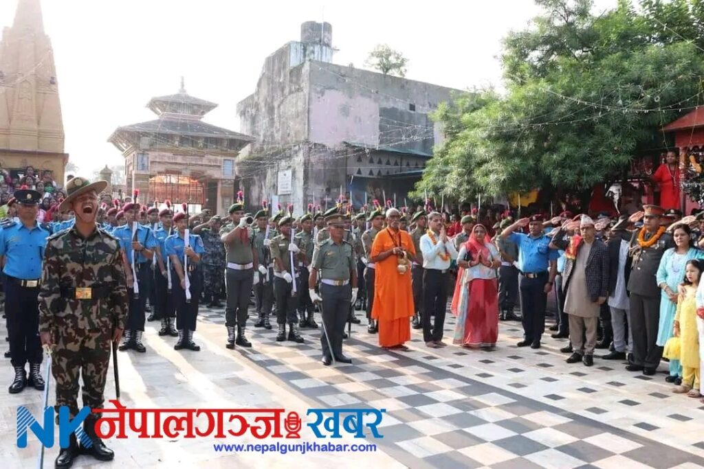 बाँके, नेपालगञ्ज । आज बाँके जिल्लाको प्रमुख धार्मिक स्थल श्री बागेश्वरी मन्दिरमा नेपाली सेना, नेपाल प्रहरी र सशस्त्र प्रहरीको संयुक्त टोलीले विशेष समारोहबीच फूलपाती भित्र्याएका छन्। यस अवसरमा टोलीले बिहानै मन्दिरमा पूजा अर्चना गरी फूलपाती चढाएका थिए।