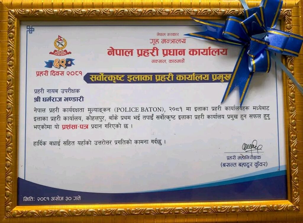 प्रहरी प्रधान कार्यालयले इलाका प्रहरी कार्यालय कोहलपुर बाँकेलाई सर्वोत्कृष्ट प्रहरी कार्यालय र कार्यालय प्रमुख धर्मराज भण्डारीलाई यस वर्षको सर्वोत्कृष्ट प्रहरी घोषित गरेको छ ।